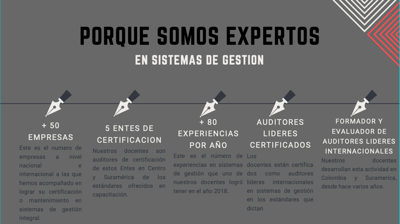 Nuestro equipo de trabajo esta conformado por profesionales que ademas de acompañar a las empresas en asesoría y formación, también se desempeñan como auditores de certificación en diferentes normas ISO para diversos entes de certificación internacional, lo cual nos permite tener un panorama completo de la efectiva aplicación de nuestro servicio.